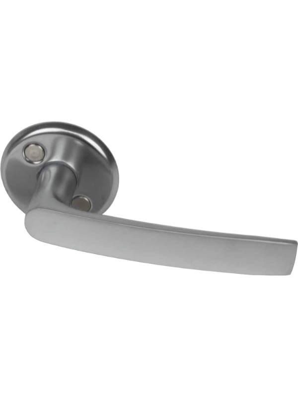 Sini väliovenpainike on ajatonta muotoilua. Pakkauksessa on molemmat kahvat, kiinnitysruuvit 2 kpl ja kara, 1 kpl. Kiinnitysruuvin vastaholkki on kiinteästi kiinni painikkeen kilvessä.