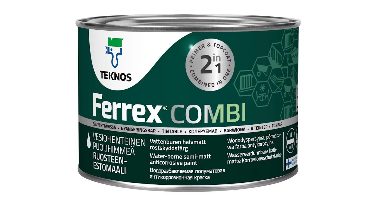 Kosteudelle ja erilaisille sääolosuhteille altistuvat metallipinnat on suojattava korroosiolta. Se estää tehokkaasti ruosteen muodostumisen maalikalvon alle ankarimmissakin olosuhteissa ja suojaa metallipintaa äärimmäisen hyvin. Vesiohenteisena maalina FERREX COMBI on miellyttävä ja turvallisempi käyttää kuin perinteiset liuotinpohjaiset korroosiosuojamaalit.
